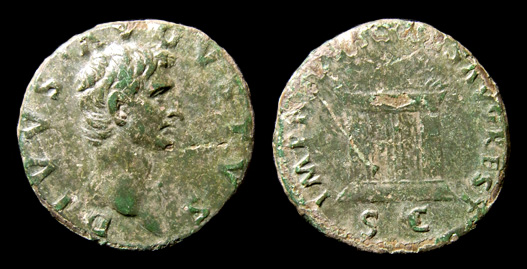 AE As Münzstätte Rom, von 96/98 n. Chr. Vs.: DIVVS AVGVSTVS Kopf n. r. Rs.: IMP NERVA CAES AVG REST / S C Altar