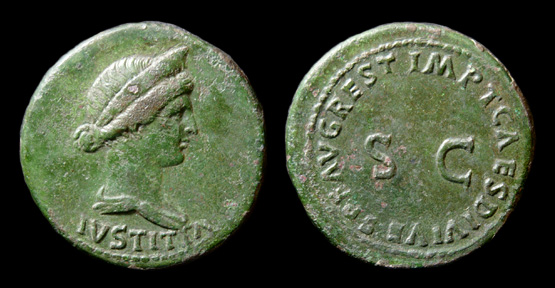 AE Dupondius Münzstätte Rom, von 80/81 Vs.: IVSTITIA Büste der Livia n. r., drapiert, mit Diadem Rs.: IMP T CAES DIVI VESP F AVG REST großes S C