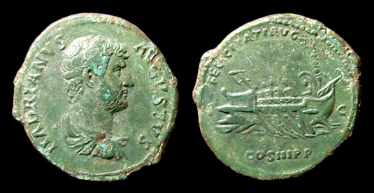 Galeere n. l. mit Steuermann und vier Ruderern; am Heck: Bogen über