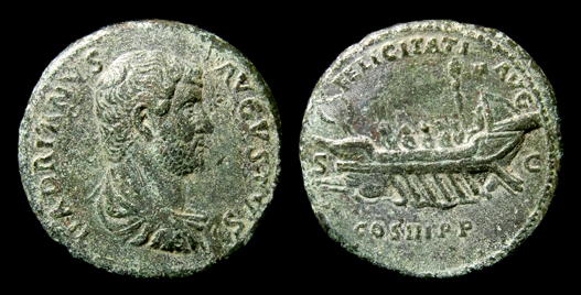 Galeere n. l. mit Steuermann und fünf Ruderern; am Heck: Bogen über