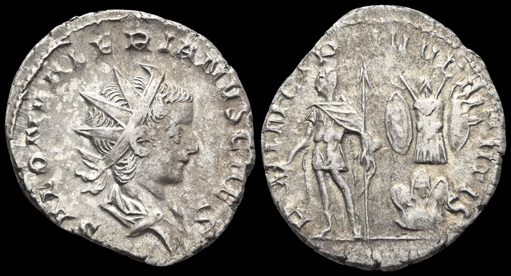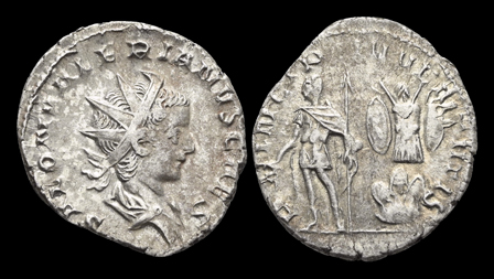 AR Antoninian Münzstätte Köln, von 258/260 Vs.: SALON VALERIANVS CAES Büste n. r., drapiert, mit Strahlenkrone Rs.: PRINCIPI IVVENTVTIS Saloninus steht n. l. mit Stab und Lanze, dahinter Trophäe und Schilde
