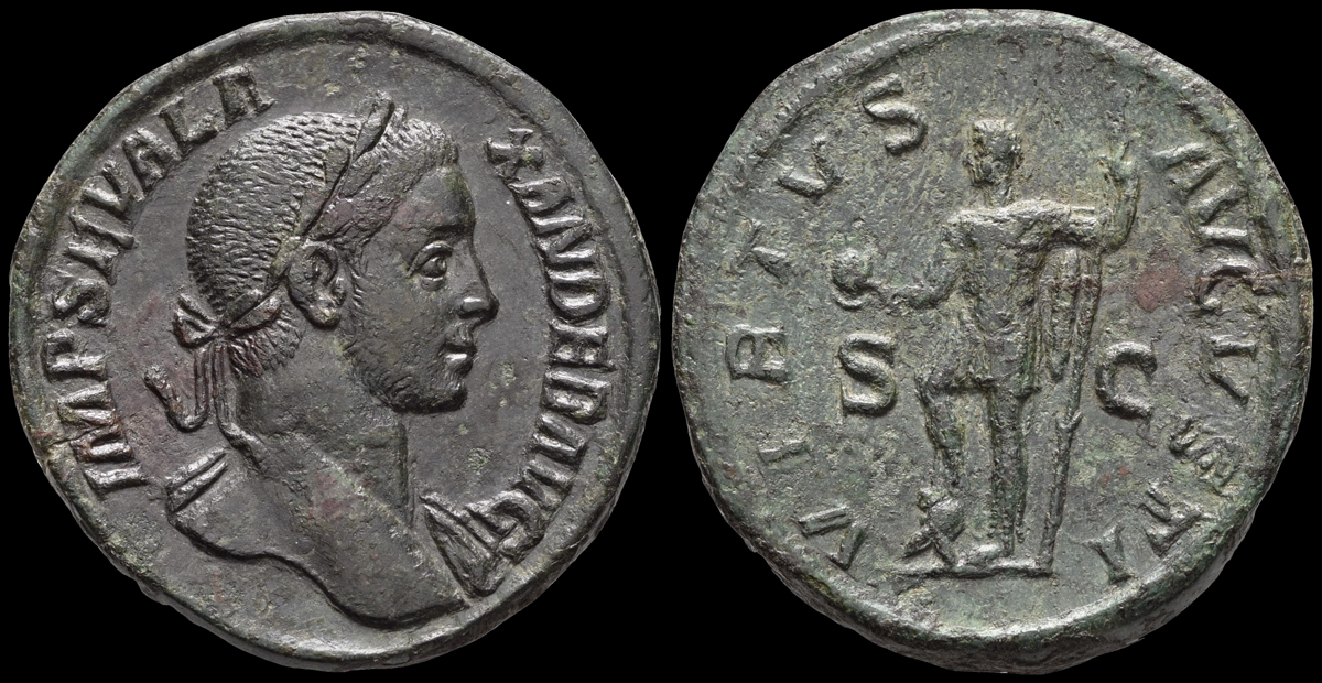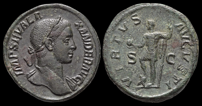 Severus Alexander steht n. l., Fuß auf Helm, mit Globus und Speer