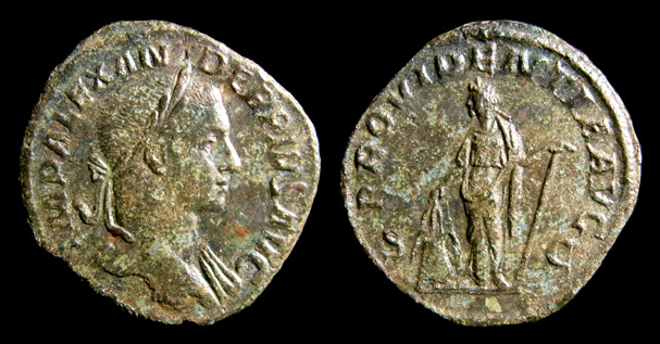 Providentia steht n. l., hält Kornähren über Modius und Anker