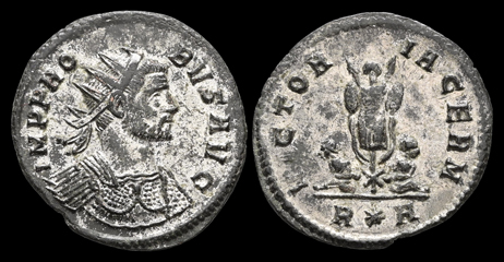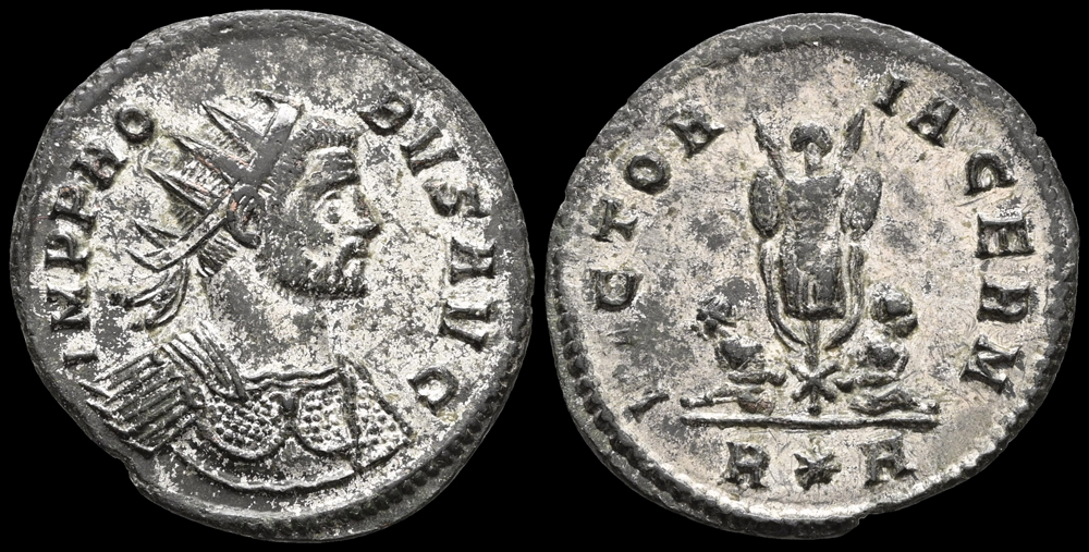AE Antoninian Münzstätte Rom, 1. Offizine Vs.: IMP PROBVS AVG Büste n. r., gepanzert, mit Strahlenkrone Rs.: VICTORIA GERM / R Stern A Trophäe zwischen zwei am Boden sitzenden Gefangenen