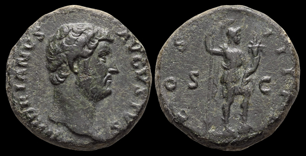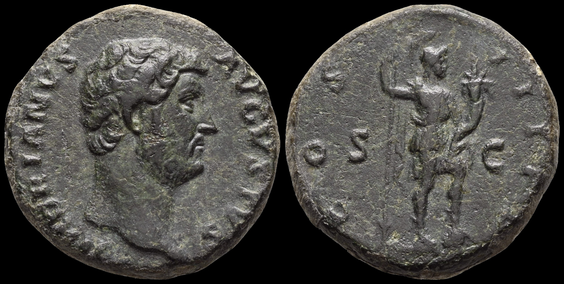 AE Dupondius Münzstätte Rom, von 129/130 Vs.: HADRIANVS AVGVSTVS Kopf n. r. Rs.: COS III P P S C Roma steht n. r. mit Speer und Füllhorn, Fuß auf Helm