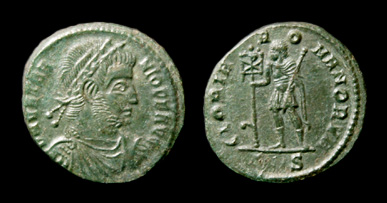 AE Centenionalis Münzstätte Siscia, 4. Offizine Vs.: D N VETRANIO P F AVG Büste n. r., drapiert und gepanzert, mit Lorbeerkranz Rs.: GLORIA ROMANORVM / DSIS Vetranio steht n. l. mit Christogramm-Standarte und Speer