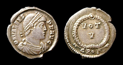 AR Siliqua Münzstätte Constantinopolis, 3. Offizine, von 364/367 Vs.: D N VALENS P F AVG Büste n. r., drapiert und gepanzert, mit Perldiadem Rs.: - / CP . G VOT / V im Kranz
