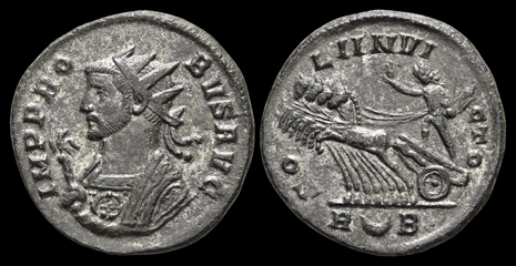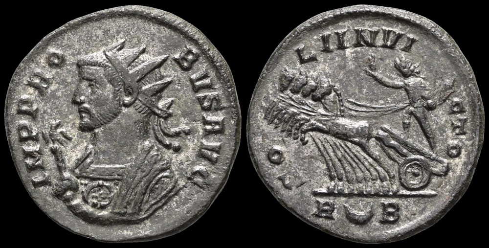 Sol in galoppierender Quadriga n. l., die rechte Hand erhoben, in der