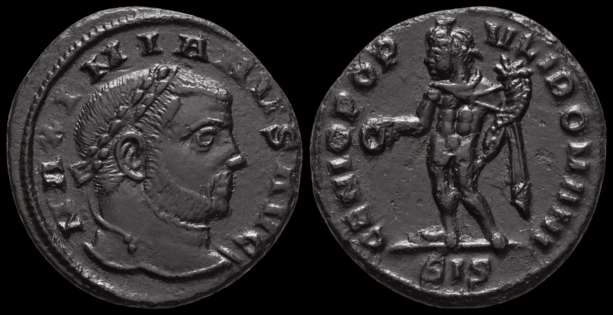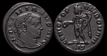 AE Viertelfollis Münzstätte Siscia, von 305/306 Vs.: MAXIMIANVS AVG Kopf n. r. mit Lorbeerkranz Rs.: GENIO POPVLI ROMANI / SIS Genius steht n. l. mit Patera und Füllhorn