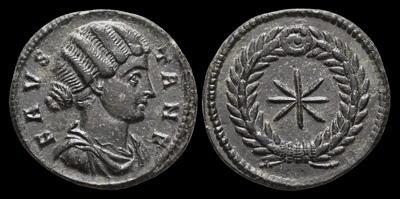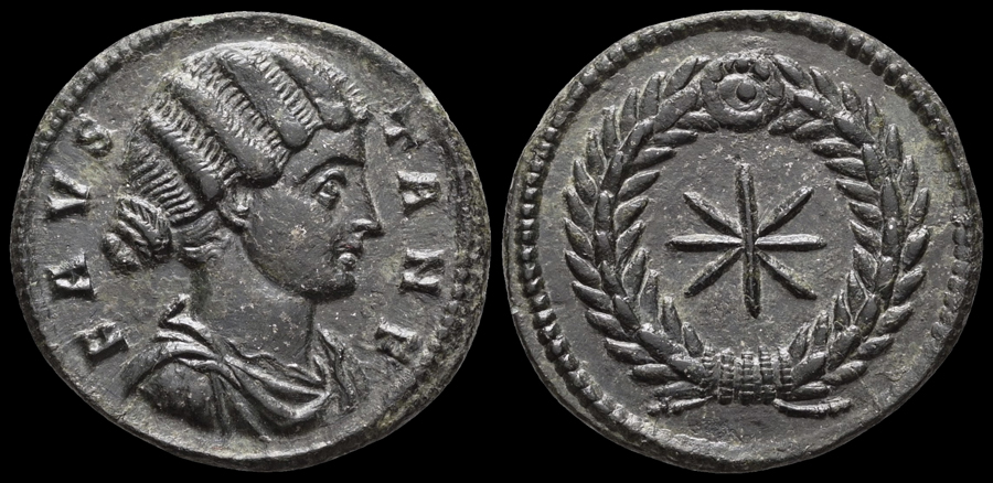 AE Follis Münzstätte Thessalonica, von 318/319 Vs.: FAVSTA N F Büste n. r., drapiert Rs.: Achtstrahliger Stern im Lorbeerkranz