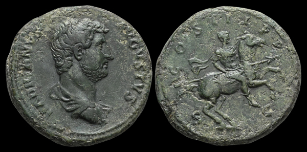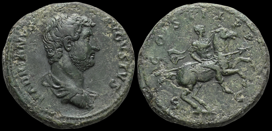 Hadrian galoppiert auf Pferd n. r. und hält Speer