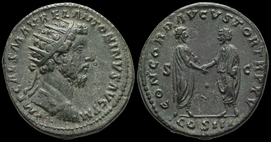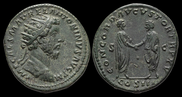 Marc Aurel und Lucius Verus stehen sich gegenüber, geben sich die rechte