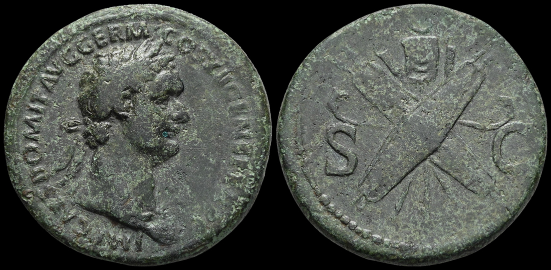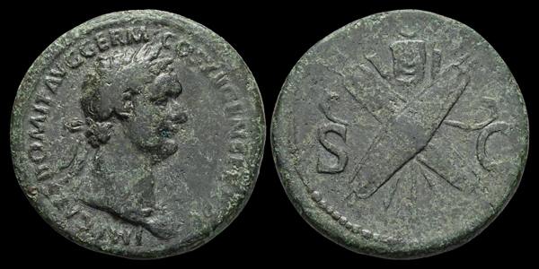 AE As Münzstätte Rom, von 86 Vs.: IMP CAES DOMIT AVG GERM COS XII CENS PER P P Kopf n. r., mit Aegis, mit Lorbeerkranz Rs.: S C Vexillum, davor gekreuzt: zwei längliche, sechseckige Schilde, zwei Trompeten und zwei Hörner