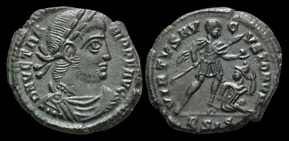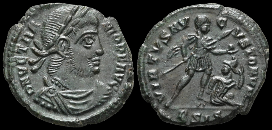 AE Centenionalis Münzstätte Siscia, 2. Offizine Vs.: D N VETRANIO P F AVG Büste n. r., drapiert und gepanzert, mit Lorbeerkranz Rs.: VIRTVS AVGVSTORVM / BSIS Vetranio steht n. r. mit Speer und Globus, davor sitzender Gefangener n. r.