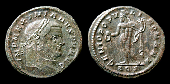 AE Follis Münzstätte Aquileia, 2. Offizine, von 297/298 Vs.: IMP MAXIMIANVS P F AVG Kopf n. r. mit Lorbeerkranz Rs.: GENIO POPVLI ROMANI / AQS Genius steht n. l. mit Patera und Füllhorn