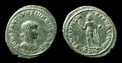 Sol steht n. l. mit erhobener rechter Hand und Globus in der linken