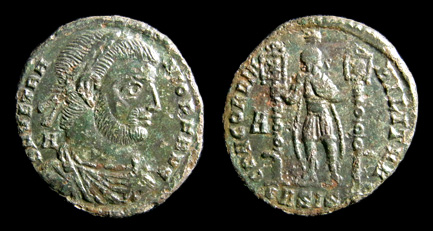 Vetranio steht n. l. mit zwei Christogramm-Standarten, über dem Kopf