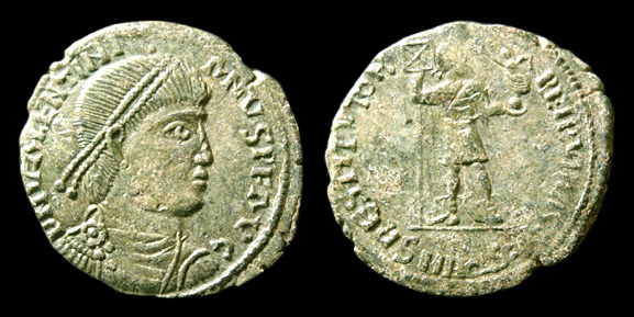 Auf den offiziellen Prägungen enthält die Standarte des Kaisers immer ein Christogramm. Offensichtlich waren die Nachahmer keine Christen, denn entweder verstanden sie das christliche Symbol nicht oder sie ersetzten es bewusst durch ein einfaches diagonales Kreuz. Die Nachahmer waren aber wohl des Lateinischen mächtig, da die Legenden - anders als bei vielen anderen Nachprägungen - fehlerfrei sind. Dagegen haben sie den Sinn des Münzstättenzeichens nicht verstanden. Dieses ist von der Vorlage komplett unleserlich kopiert worden. Barbarische Nachprägungen dieser späten Großbronzen sind - speziell in dieser Erhaltung - äußerst selten. |