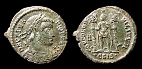 Vetranio steht n. l. mit zwei Christogramm-Standarten, über dem Kopf