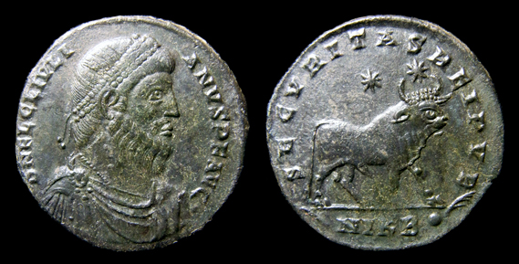 AE Doppelmaiorina Münzstätte Nicomedia, 2. Offizine, von 361/363 Vs.: D N FL CL IVLIANVS P F AVG Büste n. r., drapiert und gepanzert, mit Perldiadem Rs.: SECVRITAS REI PVB / Zweig NIKB . Zweig Stier steht n. r., darüber zwei Sterne