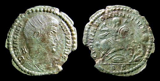 Magnentius galoppiert n. r., sticht mit Speer auf knienden Feind n. l. mit