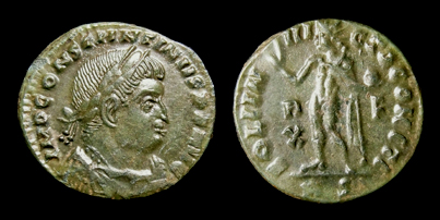 Sol steht n. l. mit erhobener rechter Hand und Globus; im Feld links: R /