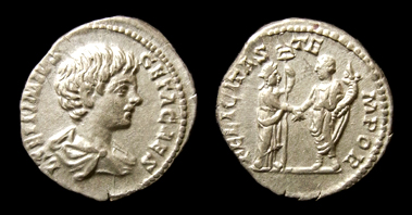 Felicitas steht n. r. mit langem Caduceus, gibt sich die Hand mit Geta,