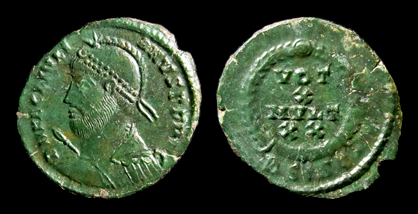 AE Centenionalis Münzstätte Siscia, 2. Offizine, von 361/363 Vs.: D N FL CL IVLIANVS P F AVG Büste n. l., gepanzert, mit diademiertem Helm, Speer und Schild Rs.: - / Zweig BSISC . VOT / X / MVLT / XX im Kranz