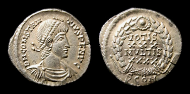 AR Siliqua Münzstätte Arelate, 2. Offizine, von 355/361 Vs.: D N CONSTANTIVS P F AVG Büste n. r., drapiert und gepanzert, mit Perldiadem Rs.: - / SCON VOTIS / XXX / MVLTIS / XXXX im Kranz