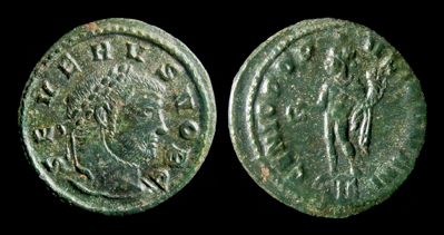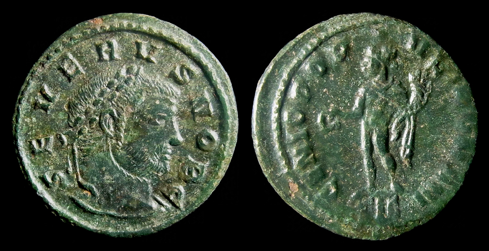 AE Viertelfollis Münzstätte Siscia, von 305/306 Vs.: SEVERVS NOB C Kopf n. r. mit Lorbeerkranz Rs.: GENIO POPVLI ROMANI / SIS Genius steht n. l. mit Patera und Füllhorn