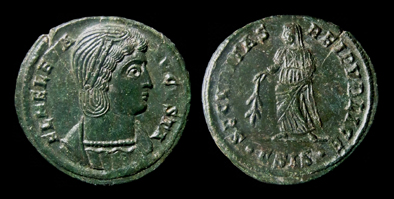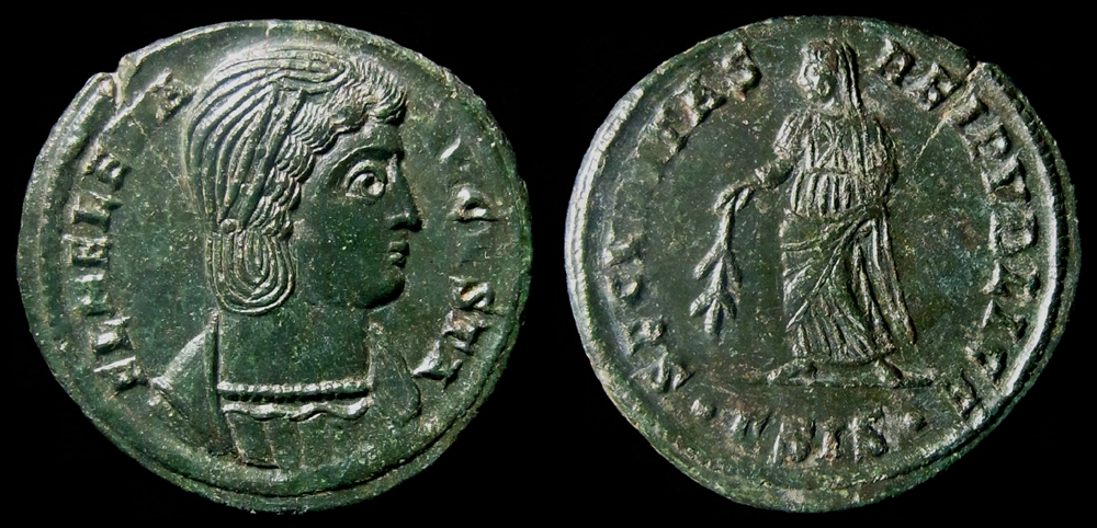 AE Follis Münzstätte Siscia, 3. Offizine, von 326/327 Vs.: FL HELENA AVGVSTA Büste n. r., drapiert, mit Diadem Rs.: SECVRITAS REI PVBLICE / . Gamma SIS . Securitas steht n. l. mit Zweig
