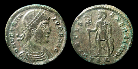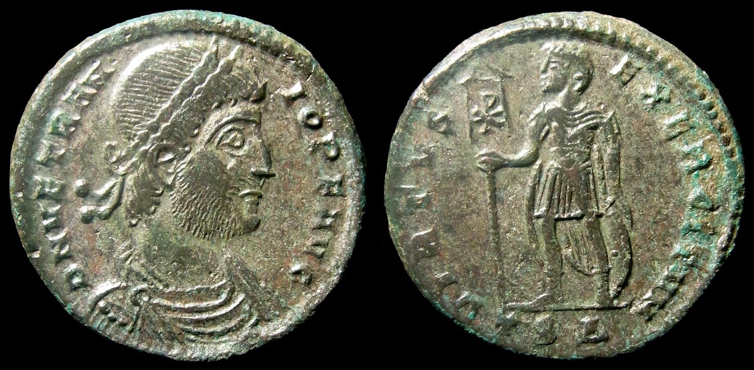 AE Maiorina Münzstätte Thessalonica, 4. Offizine Vs.: D N VETRANIO P F AVG Büste n. r., drapiert und gepanzert, mit Lorbeerkranz Rs.: VIRTVS EXERCITVM / TS Delta Vetranio steht n. l. mit Christogramm-Standarte und Schild