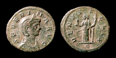 AE Denar Münzstätte Rom, 5. Offizine, von 274/275 Vs.: SEVERINA AVG Büste n. r., drapiert, mit Diadem Rs.: VENVS FELIX / e Venus steht n. l., hält sitzende Figur (Cupido?) in der rechten Hand und Zepter mit der linken
